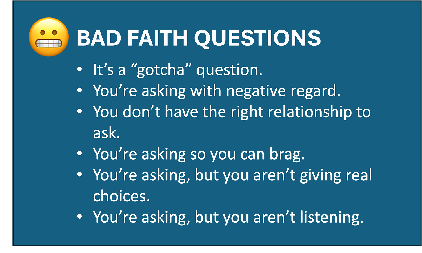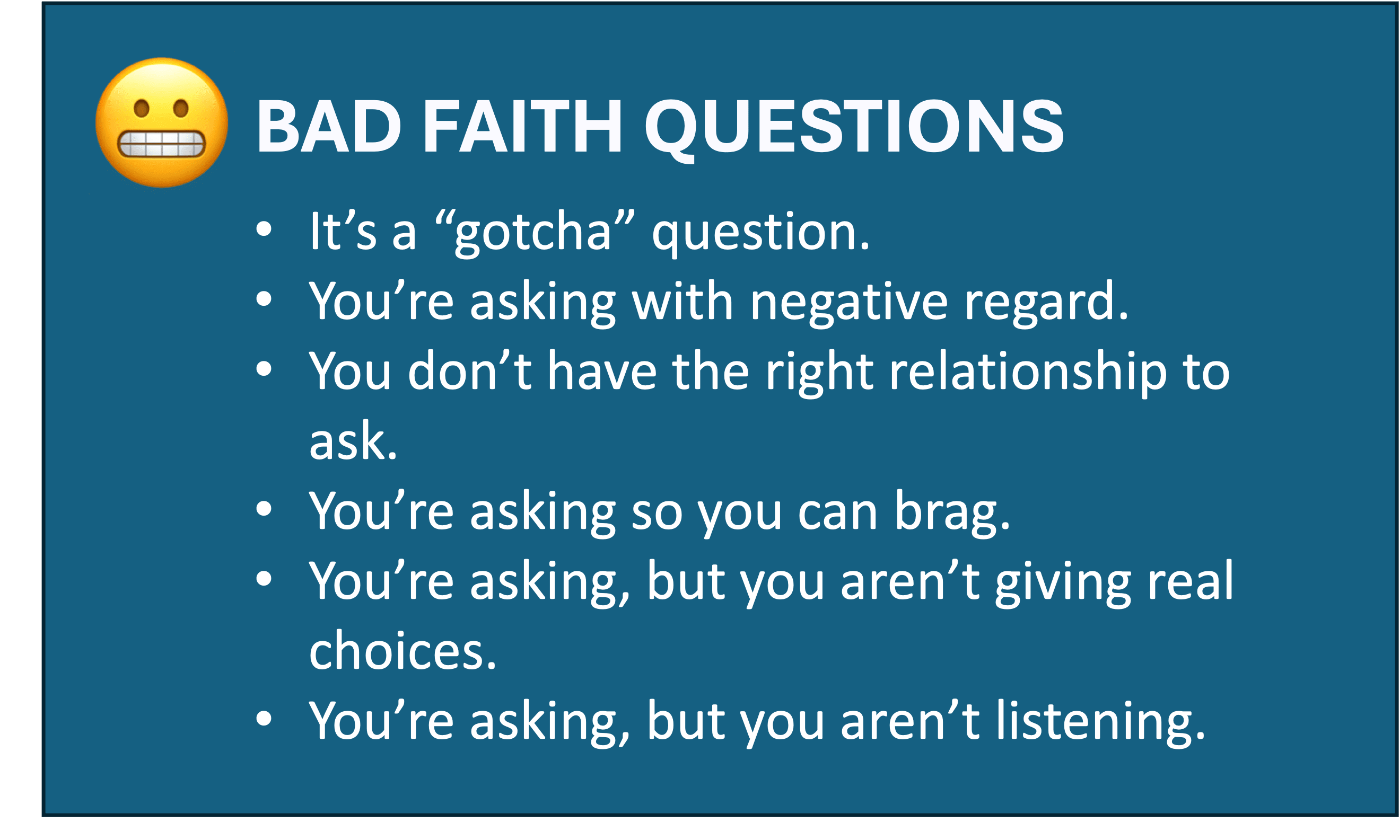 If the only reason you’re asking a question is in hope that question will also be asked of you, then it might be a bad faith question. Examples:
